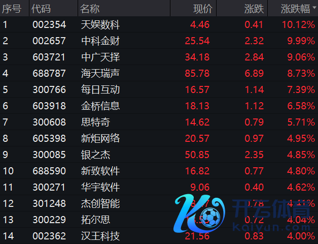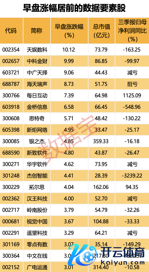 早盘,多只数据成分想法股显着走高,中科金财、天娱数科涨停,金桥信息、中广天择盘中涨停,海天瑞声、逐日互动、想特奇等涨幅居前。
