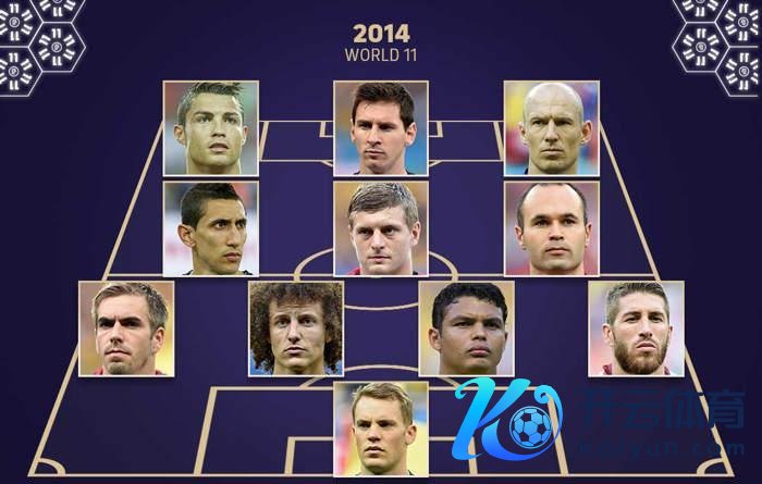 门将:诺伊尔(德国);后卫:拉姆(德国)、大卫-路易斯(巴西)、蒂亚戈-席尔瓦(巴西)、拉莫斯(西班牙);中场:迪玛利亚(阿根廷)、克罗斯(德国)、伊涅斯塔(西班牙);时尚:C罗(葡萄牙)、梅西(阿根廷)、罗本(荷兰)