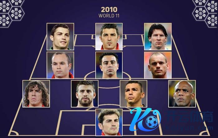 门将:卡西利亚斯(西班牙);后卫:普约尔(西班牙)、皮克(西班牙)、卢西奥(巴西)、麦孔(巴西);中场:伊涅斯塔(西班牙)、哈维(西班牙)、斯内德(荷兰);时尚:C罗(葡萄牙)、比利亚(西班牙)、梅西(阿根廷)