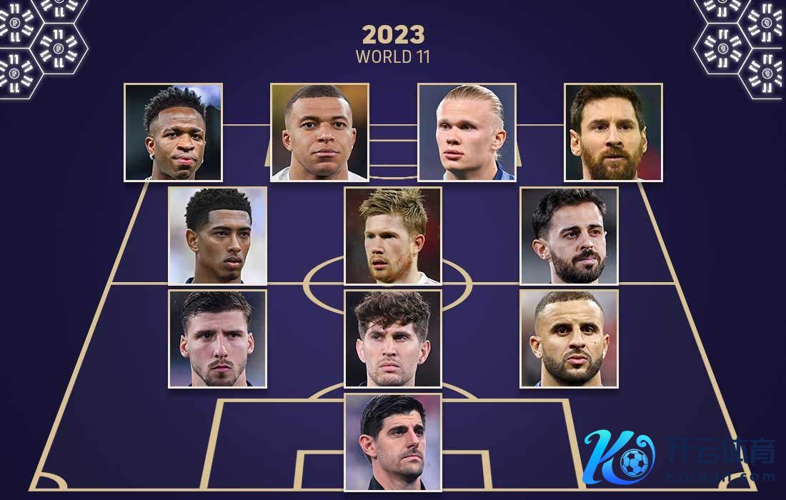 门将:库尔图瓦(比利时);后卫:沃克(英格兰)、斯通斯(英格兰)、迪亚斯(葡萄牙);中场:B席(葡萄牙)、德布劳内(比利时)、贝林厄姆(英格兰);时尚:梅西(阿根廷)、哈兰德(挪威)、姆巴佩(法国)、维尼修斯(巴西)