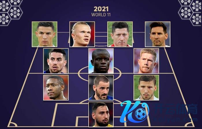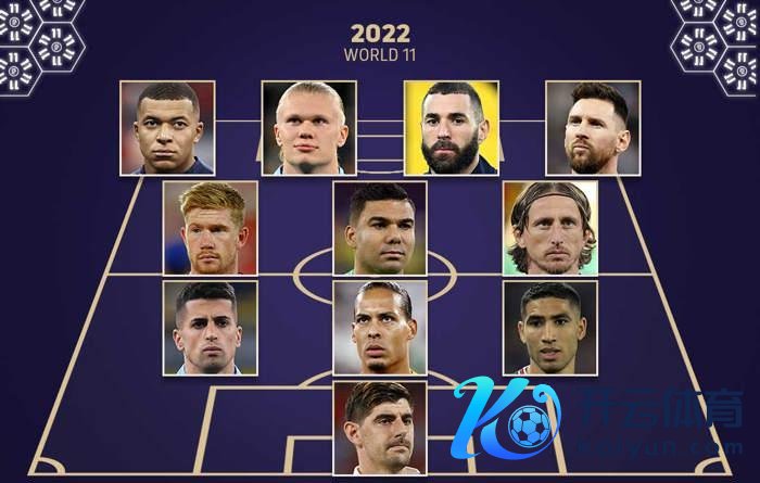 门将:库尔图瓦(比利时);后卫:坎塞洛(葡萄牙)、范迪克(荷兰)、阿什拉夫(摩洛哥);中场:德布劳内(比利时)、卡塞米罗(巴西)、莫德里奇(克罗地亚);时尚:姆巴佩(法国)、哈兰德(挪威)、本泽马(法国)、梅西(阿根廷)