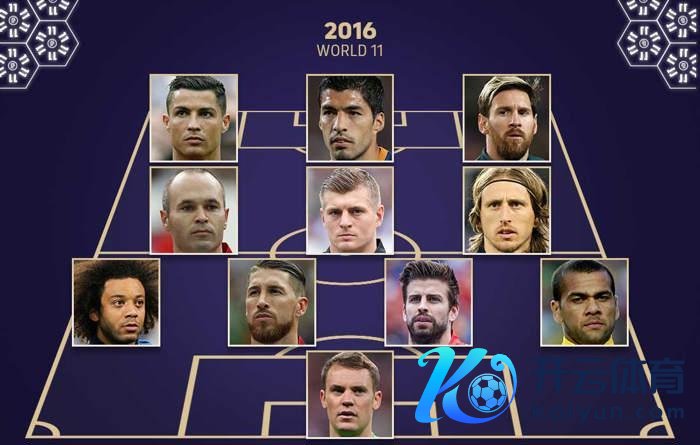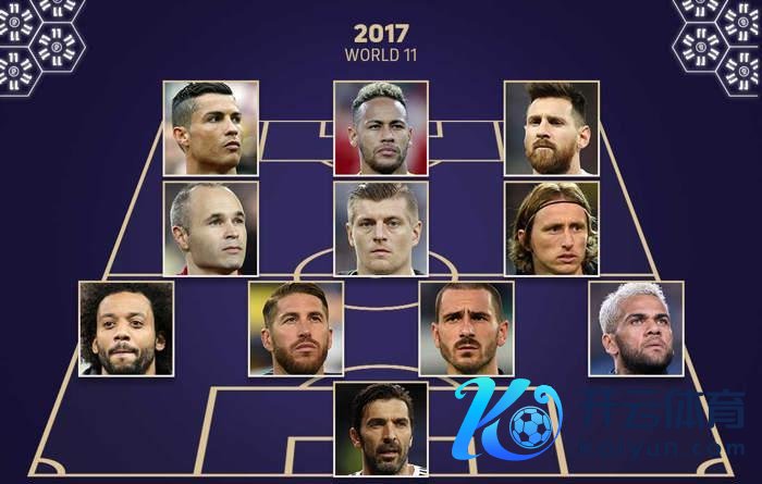 门将:布冯(意大利);后卫:马塞洛(巴西)、拉莫斯(西班牙)、博努奇(意大利)、阿尔维斯(巴西);中场:伊涅斯塔(西班牙)、克罗斯(德国)、莫德里奇(克罗地亚);时尚:C罗(葡萄牙)、内马尔(巴西)、梅西(阿根廷)