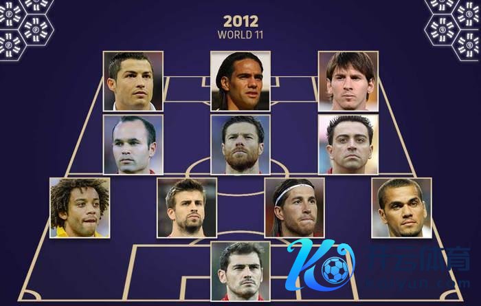 门将:卡西利亚斯(西班牙);后卫:马塞洛(巴西)、皮克(西班牙)、拉莫斯(西班牙)、阿尔维斯(巴西);中场:伊涅斯塔(西班牙)、阿隆索(西班牙) 、哈维(西班牙);时尚:C罗(葡萄牙)、法尔考(哥伦比亚)、梅西(阿根廷)
