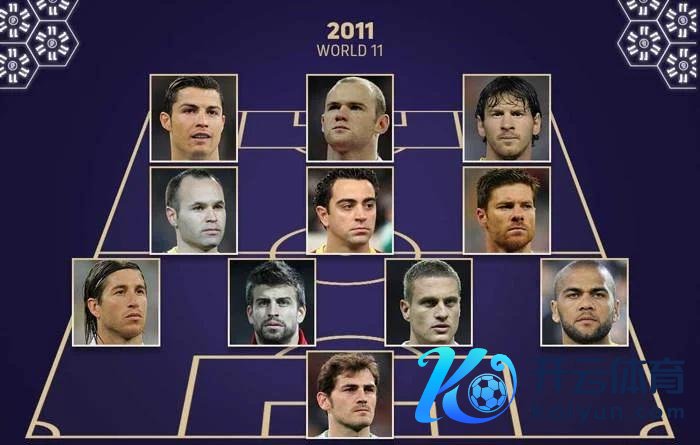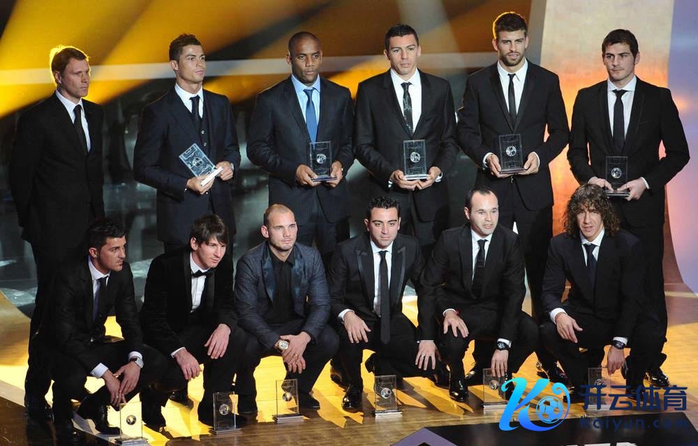 门将:卡西利亚斯(西班牙);埃弗拉(法国)、维迪奇(塞尔维亚)、特里(英格兰)、阿尔维斯(巴西);中场:伊涅斯塔(西班牙)、哈维(西班牙)、杰拉德(英格兰);时尚:C罗(葡萄牙)、托雷斯(西班牙)、梅西(阿根廷)