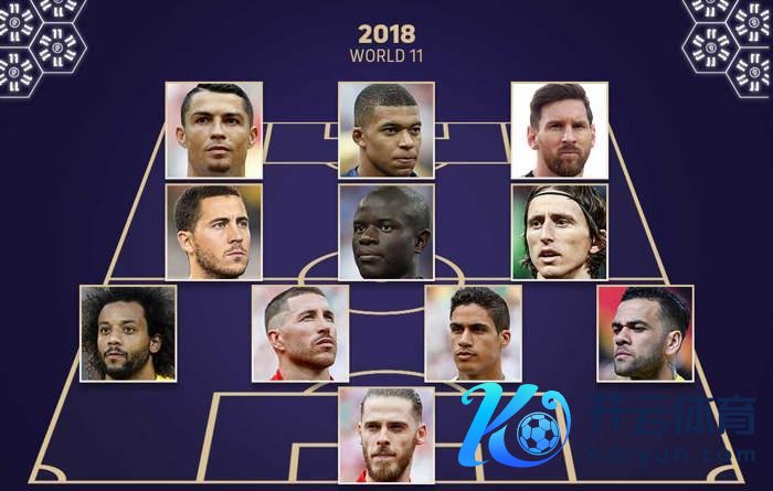 门将:德赫亚(西班牙);后卫:马塞洛(巴西)、拉莫斯(西班牙)、瓦拉内(法国)、阿尔维斯(巴西);中场:阿扎尔(比利时)、坎特(法国)、莫德里奇(克罗地亚);时尚:C罗(葡萄牙)、姆巴佩(法国)、梅西(阿根廷)