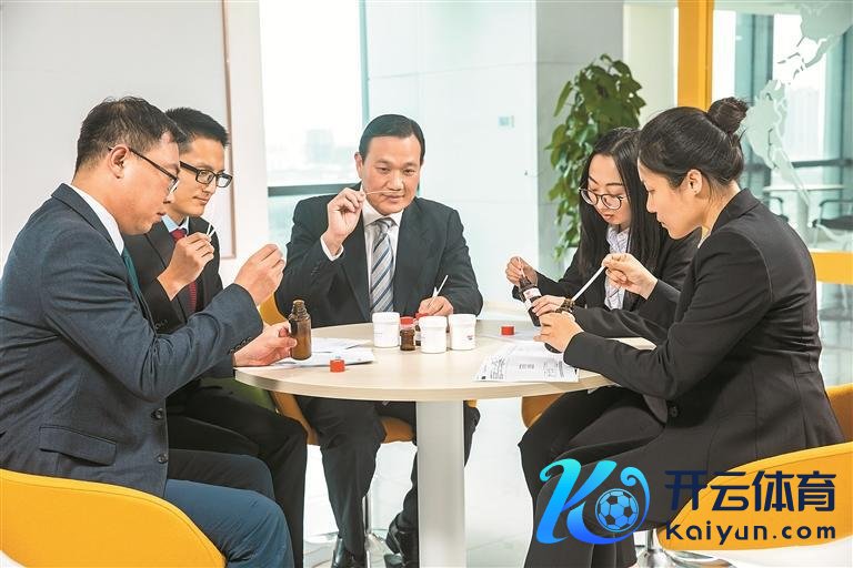 ▲王明凡(中)和研发东说念主员、调香师共同攻克时期翻新问题。贵府图