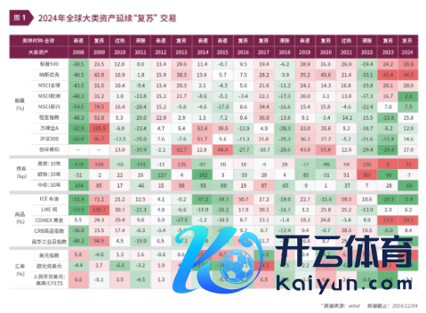 2024年全球大类金钱延续了“复苏”交往。其中,全球股市呈现普涨行情,MSCI全球指数上升超19%,好意思股依然保持强势,标普500和纳指分手上升约25%和35%。另外,商品延续高位触动分化,黄金、白银均取得约29%的正收益,铜、铝涨幅超5%,原油则有所走弱。好意思债利率全年波动上行,核心围绕4.1%呈现高位触动,好意思元运转明显走强。背后的核心驱动是全球经济增长相对自由,全球通胀也在向央行主意回来,同期全球央行也开启了新一轮的降息周期。