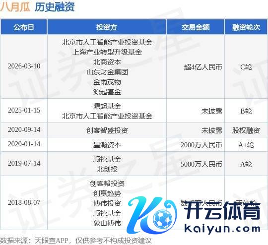 证券之星音信,左证天眼查APP于3月10日公布的信息整理,北京八月瓜科技有限公司C轮融资,融资额超4亿东说念主民币,参与投资的机构包括北京市东说念主工智能产业投资基金,上海产业转型升级基金,北商老本,山东财金集团,金雨茂物,源起基金。